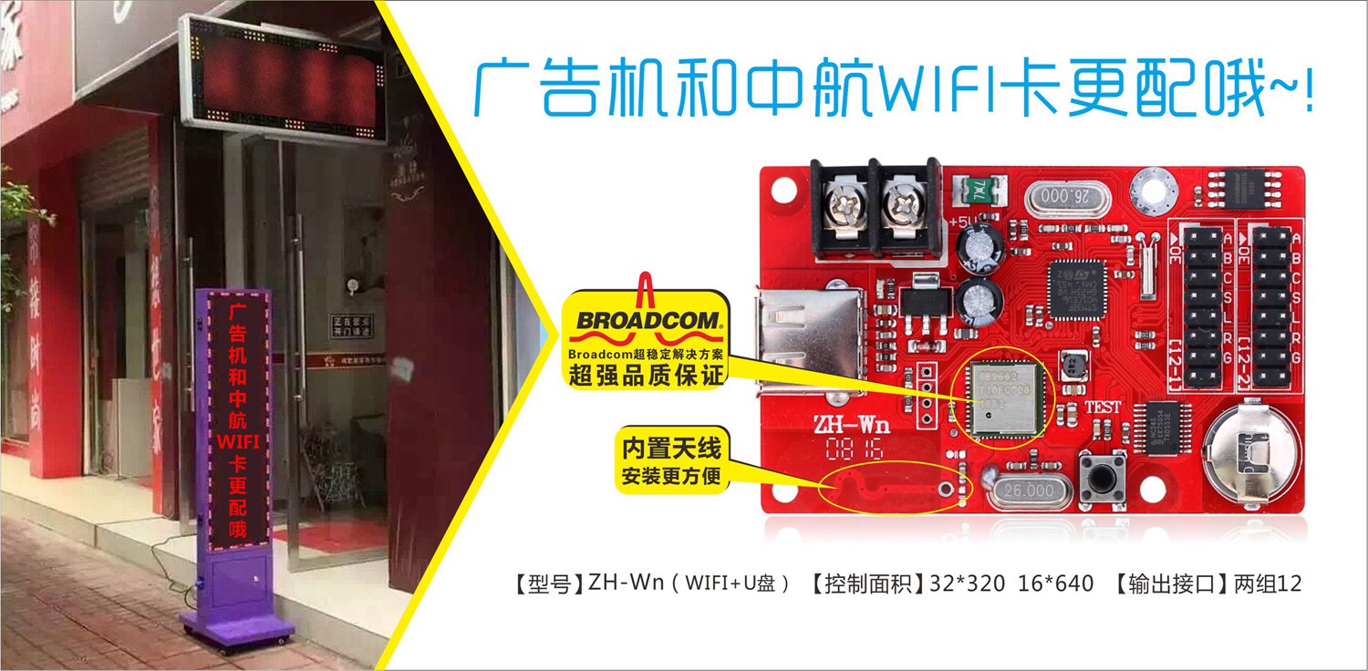 廣告機(jī)和Wi-Fi控制卡更配哦,中航軟件第六代WiFi系統(tǒng),全新通信架構(gòu),全新生產(chǎn)工藝,全球最優(yōu)秀的WiFi芯片提供商Broadcom超穩(wěn)定解決方案和全方位技術(shù)支持!為您做最好廣告機(jī)保駕護(hù)航!